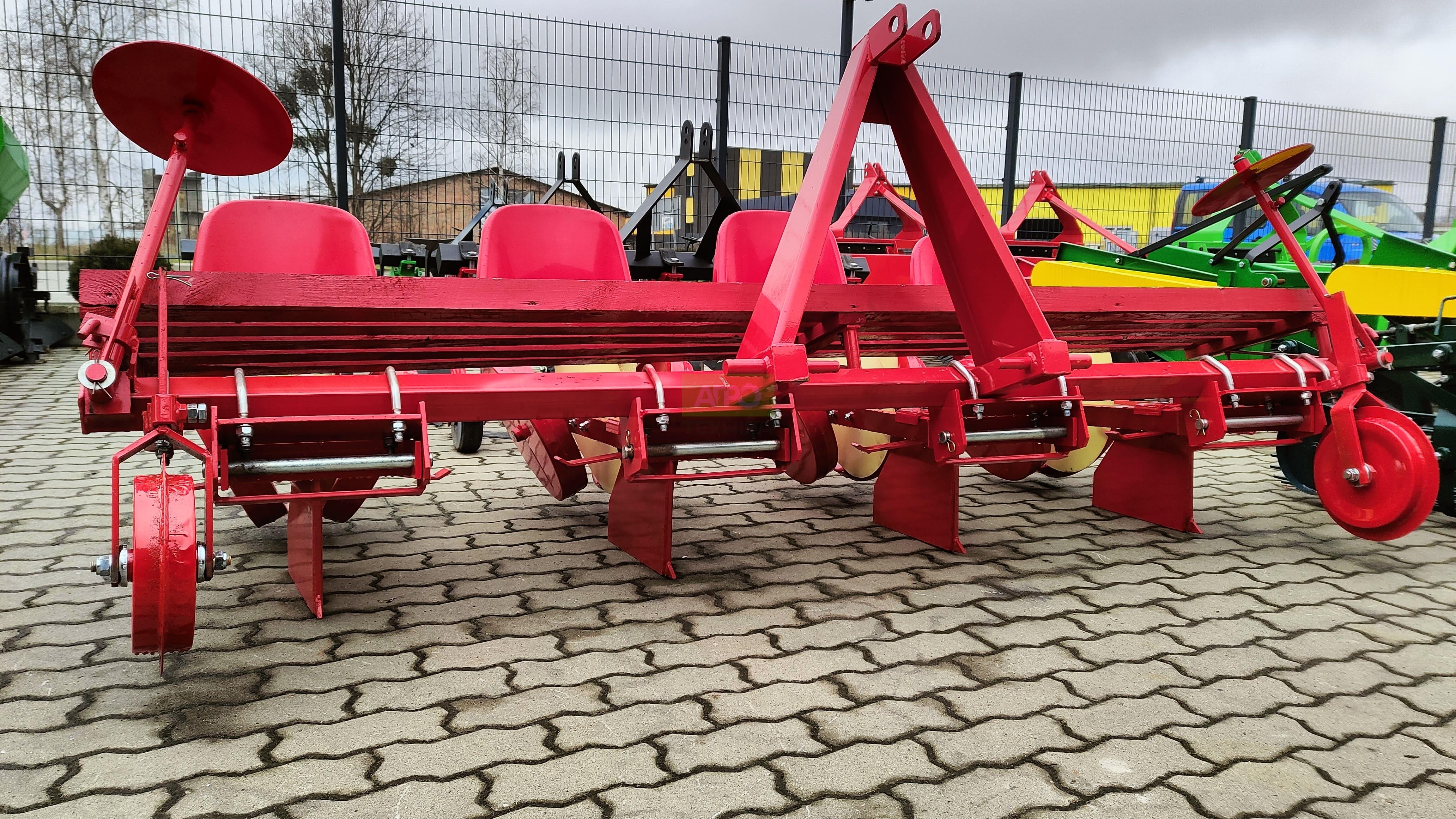 Розсадосаджалка 4-рядна для мінітрактора (A-003196) Швидка висадка овочевої розсади на 4 рядки за один прохід. 4-рядна розсадосаджалка призначена для механізованої висадки розсади овочів і саджанців: томатів, капусти, перцю, селери, салату, буряка, полуниці тощо. Підходить для фермерських та приватних господарств, а також для декоративних і лісових культур (ялина, сосна, чагарники). Агрегат висаджує одночасно 4 рядки, рівно формує борозни й акуратно ущільнює ґрунт — тож ви отримуєте швидкість, рівномірність та економію витрат. Комплектація: 4 посадкові секції, диски з маркерами, сошники, прикочувальні котки, 2 крісла операторів та платформа для розсади, опорні колеса. Переваги та особливості: Висока продуктивність без зайвих втрат. Чотири синхронні секції висаджують рівні рядки за один прохід — ідеально для середніх і великих площ. Акуратне ставлення до кореневої системи. Формування борозни сошниками й прикриття двома бічними котками захищає сіянці, зберігає вологу та зменшує стрес для рослин. Точна агрономія — стабільний урожай. Фіксовані кроки 20–120 см і регульоване міжряддя 50–115 см дозволяють підлаштувати схему висадки під культуру та технологію. Комфорт і безпека операторів. Пластикові сидіння й платформа для розсади забезпечують зручну подачу саджанців, а опорні колеса стабілізують рух агрегата на нерівних ділянках. Проста адаптація до умов поля. Регулювання глибини до 25 см та притискання котками допомагають працювати на легких і середніх ґрунтах після передпосівного обробітку. Область застосування: Культури: томати, капуста, перець, селера, салат, буряк, полуниця, а також декоративні й лісові саджанці (ялина, сосна, чагарники). Умови ефективної роботи: підготовлений вирівняний ґрунт; висота розсади 6–20 см; оптимальна вологість без перезволоження. Рекомендації з експлуатації: виставляйте міжряддя в межах 50–115 см під культуру та ширину технологічних колій; підбирайте крок висадки (20–120 см) відповідно до густоти стояння; перевіряйте тиск та чистоту прикочувальних котків — це покращує контакт кореня з ґрунтом; для розсади з ніжною кореневою системою зменшуйте швидкість руху трактора та глибину формування борозни.