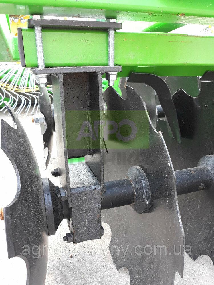 ⚙️ Дискова борона навісна 2.7 м — потужна техніка для ефективного обробітку ґрунту Дискова борона 2.7 м — це надійне сільськогосподарське знаряддя для якісної обробки щільного ґрунту перед посівом, розпушування після оранки, лущення стерні та прикриття добрив. Завдяки V-подібній конструкції та потужним дисковим батареям, ця модель гарантує високу продуктивність навіть на важких площах. 🔧 Переваги моделі: Агрегатується з тракторами від 73 к.с. Підходить для полів з ухилом, пасовищ, луків Регульований кут атаки дисків 7°–22° Можливість дооснащення катками для підвищення ефективності 📐 Технічні характеристики: Ширина захвату: 2.7 м Глибина обробки: 80–150 мм Кількість секцій: 2 Кількість дисків: 12 Діаметр диска: 510 мм Товщина диска: 4 мм Маса: 620 кг Необхідна потужність трактора: 54 кВт / 73 к.с. 🛡 Матеріали та надійність: Диски виготовлені зі спеціальної зносостійкої сталі Міцна рама забезпечує довгий термін служби Захист користувача при агрегатуванні з трактором завдяки зчіпній балці