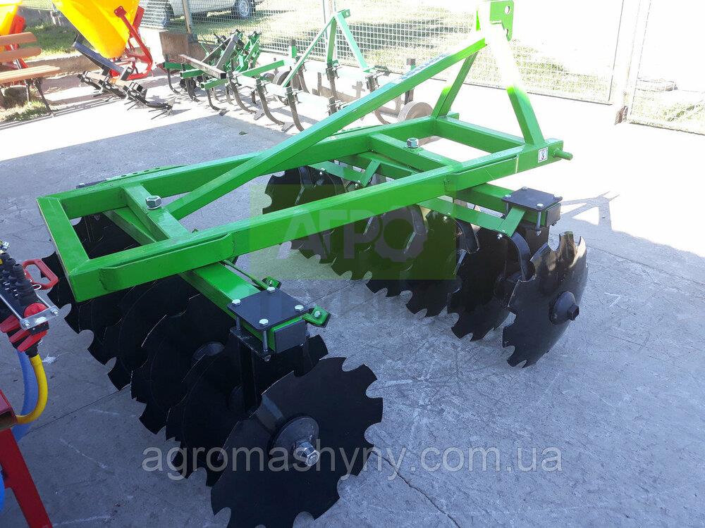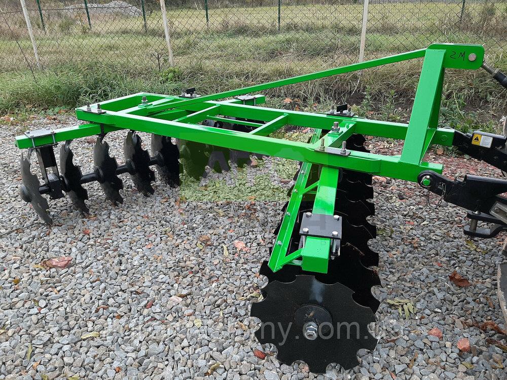 ⚙️ Дискова борона 2.0 м навісна — надійна техніка для обробки ґрунту Дискова борона навісна з шириною захоплення 2.0 м — це універсальне сільськогосподарське знаряддя, призначене для передпосівної обробки щільних ґрунтів, подрібнення рослинних решток, перемішування гною та добрив із землею. Ідеально підходить для фермерських господарств, які цінують якість, ефективність і простоту застосування. 🔧 Призначення: Розпушування ущільненого або зораного ґрунту Подрібнення дернини на луках і пасовищах Лущення стерні після збирання врожаю Перемішування органічних або мінеральних добрив Застосування у весняно-осінній сезон 🛠 Технічні характеристики: Ширина захоплення: 2.0 м Кількість дисків: 9 шт (в 2 секціях по 4+5) Діаметр дисків: 510 мм Товщина дисків: 4 мм Глибина обробки: 80–150 мм Кут атаки дисків: 7°–22° (регульований) Маса: 420 кг Необхідна потужність трактора: 40–55 к.с. Кількість секцій: 2 Тип: навісна V-подібна конструкція Матеріал дисків: загартована спеціальна сталь ✅ Переваги: Підходить для різних типів ґрунтів, окрім кам’янистих Швидке налаштування кута дисків під умови поля Надійна конструкція із загартованих сталевих компонентів Можливість дооснащення трубчастим або струнним котком Просте зчеплення з трактором за допомогою трьохточкової навіски 🧰 Сумісність: Трактори потужністю від 40 к.с. Агрегатується з технікою класу МТЗ, ЮМЗ, DF, Jinma, Lovol, Belarus