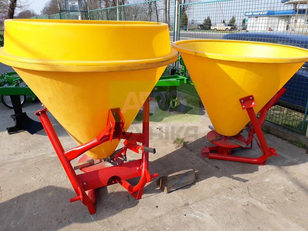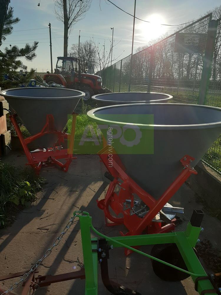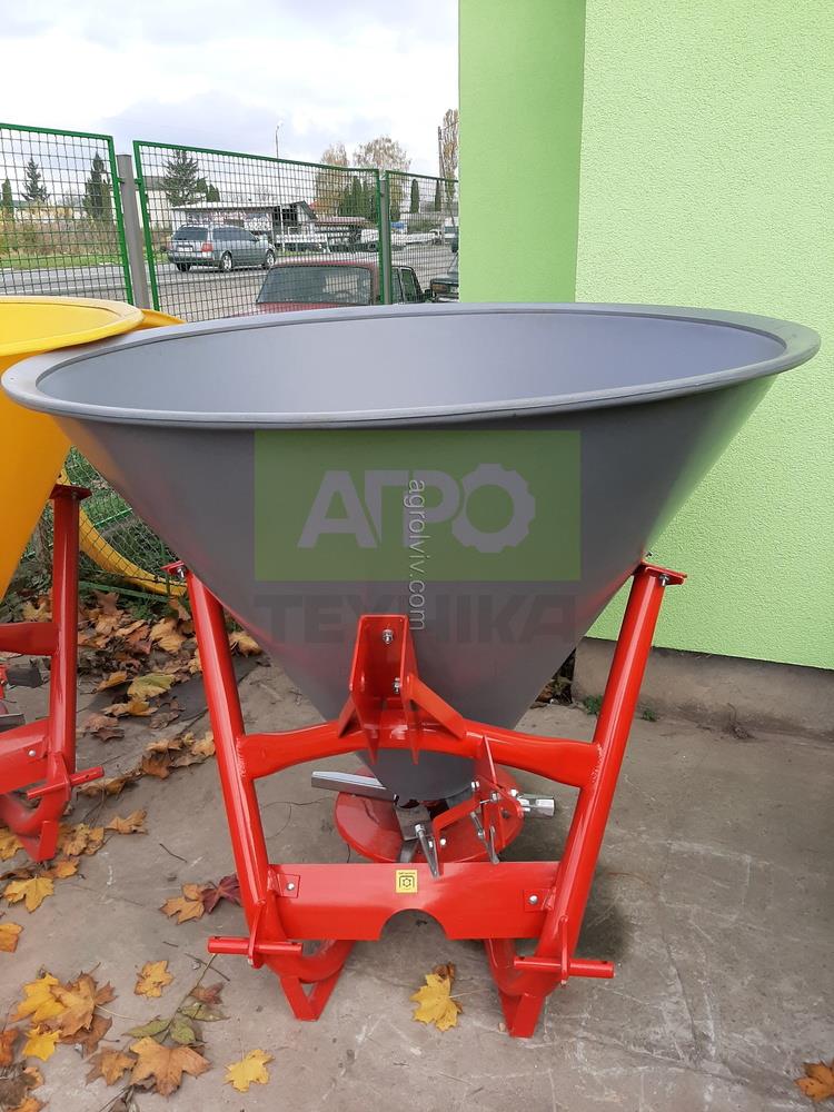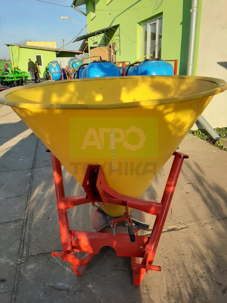Розсіювач мінеральних добрив на 500 кг Розсіювачі мінеральних добрив використовуються для поверхневого внесення та розкидання гранульованих мінеральних добрив на полях, луках, пасовищах і ріллі. Конструктивно обладнані конусним резервуаром з пластику чи металу місткістю 300, 500, 650 кг або 1.0 тонну. Модель на 500 кг — це навісний однодисковий розсіювач з 4 лопатками, який агрегатується з тракторами потужністю від 20 кінських сил. Обладнаний трьохточковим кріпленням для надійного з'єднання з трактором. Резервуар має форму конуса, що забезпечує ефективне переміщення добрив до вихідних отворів. Дозування здійснюється через два регульованих отвори, контрольовані важільним механізмом із затворами. Розподіл добрив здійснюється через обертовий диск, що приводиться в дію від карданного валу через редуктор. Всередині резервуара добрива перемішуються мішалкою, яка теж працює від редуктора. Відцентрова сила обертового диска забезпечує рівномірне розкидання добрив по площі. Основні характеристики: Тип: навісний Об’єм бака: 500 л Кількість дисків: 1 Кількість лопаток: 4 Ширина розкидання: 6–14 м Норма висіву: 50–1500 кг/га Оберти вала відбору потужності: 540 об/хв Необхідна потужність трактора: від 20 к.с. Робоча швидкість: до 14 км/год Габарити: 1.45 × 1.45 × 1.55 м Вага: 105 кг