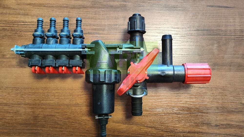 Розподільник польового обприскувача — важливий елемент системи точного оброблення рослин Розподільник для обприскувача, також знайомий як регулятор тиску, є однією з найважливіших деталей обприскувача після насоса. Він відповідає за рівномірне постачання робочої рідини під необхідним тиском на штангу обприскувача, котра через форсунки розпилює захисні препарати та добрива на рослини. За допомогою регулятора тиску оператор може точно налаштувати тиск, оптимальний для конкретного виду обробки та культури, що гарантує ефективне і економне використання хімічних речовин. Тиск, встановлений на розподільнику, контролюється через манометр, що дозволяє оперативно реагувати на зміни в роботі агрегату. Розподільник зазвичай має три, чотири або більше секцій, які можна вмикати чи вимикати окремо, що дає змогу обробляти лише потрібні ділянки поля. Це підвищує гнучкість і точність у роботі, дозволяє уникнути зайвих витрат та забезпечує екологічну безпеку. Подачу рідини під тиском до розподільника забезпечує насос обприскувача, тому надійність і якість розподільника безпосередньо впливають на загальну ефективність роботи обприскувача. Ціна зазначена за розподільник на 4 виходи без манометра. Для отримання якісного розподільника польового обприскувача звертайтеся до нашої компанії — гарантуємо надійність, довговічність та професійний сервіс!