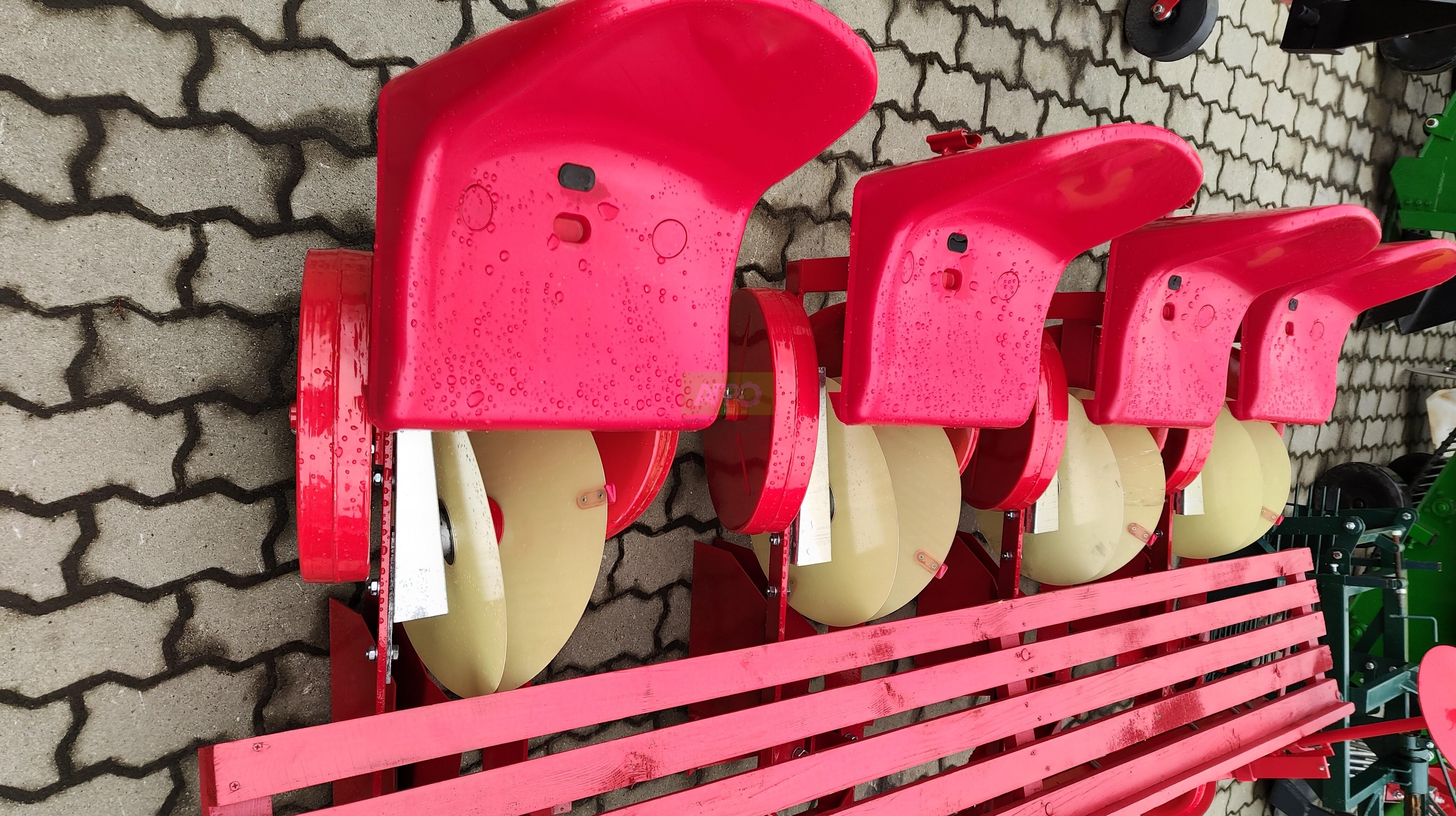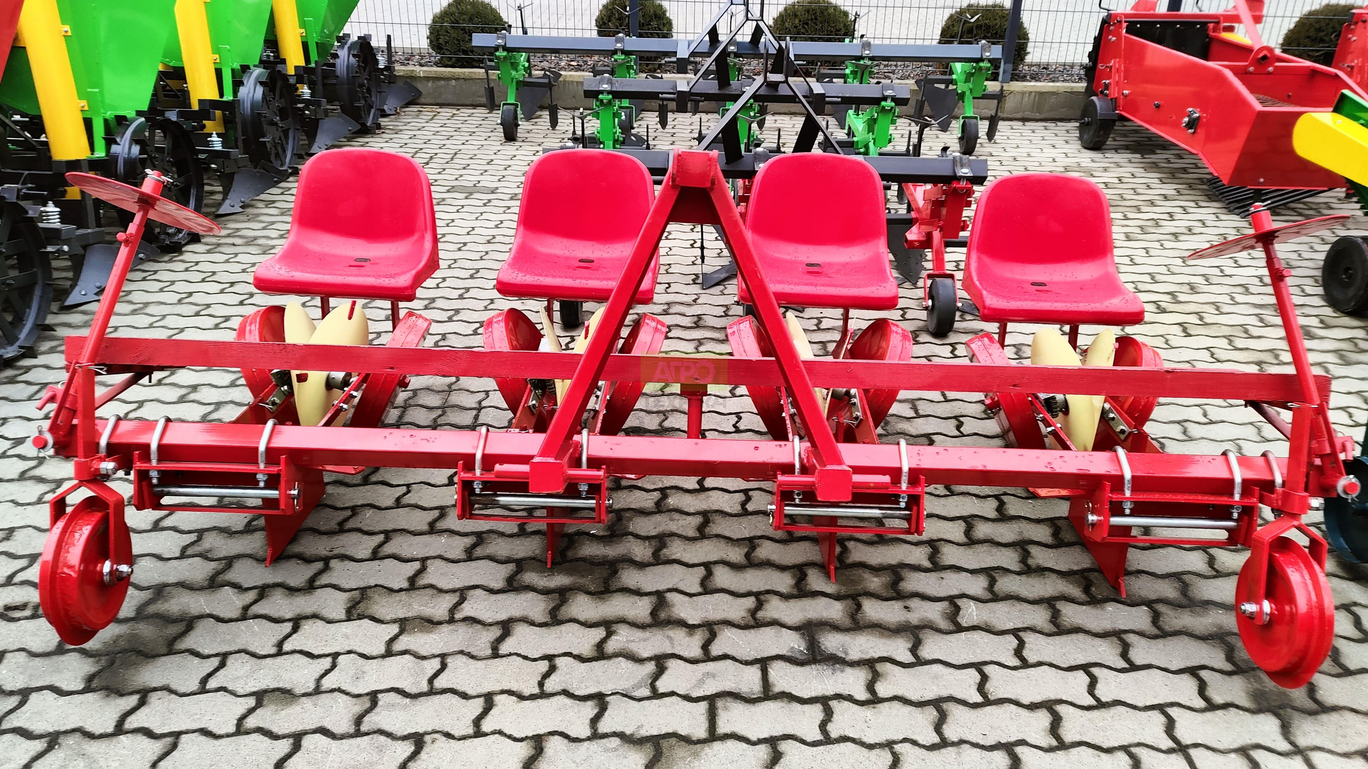 Розсадосаджалка 4-рядна для мінітрактора (A-003196) Швидка висадка овочевої розсади на 4 рядки за один прохід. 4-рядна розсадосаджалка призначена для механізованої висадки розсади овочів і саджанців: томатів, капусти, перцю, селери, салату, буряка, полуниці тощо. Підходить для фермерських та приватних господарств, а також для декоративних і лісових культур (ялина, сосна, чагарники). Агрегат висаджує одночасно 4 рядки, рівно формує борозни й акуратно ущільнює ґрунт — тож ви отримуєте швидкість, рівномірність та економію витрат. Комплектація: 4 посадкові секції, диски з маркерами, сошники, прикочувальні котки, 2 крісла операторів та платформа для розсади, опорні колеса. Переваги та особливості: Висока продуктивність без зайвих втрат. Чотири синхронні секції висаджують рівні рядки за один прохід — ідеально для середніх і великих площ. Акуратне ставлення до кореневої системи. Формування борозни сошниками й прикриття двома бічними котками захищає сіянці, зберігає вологу та зменшує стрес для рослин. Точна агрономія — стабільний урожай. Фіксовані кроки 20–120 см і регульоване міжряддя 50–115 см дозволяють підлаштувати схему висадки під культуру та технологію. Комфорт і безпека операторів. Пластикові сидіння й платформа для розсади забезпечують зручну подачу саджанців, а опорні колеса стабілізують рух агрегата на нерівних ділянках. Проста адаптація до умов поля. Регулювання глибини до 25 см та притискання котками допомагають працювати на легких і середніх ґрунтах після передпосівного обробітку. Область застосування: Культури: томати, капуста, перець, селера, салат, буряк, полуниця, а також декоративні й лісові саджанці (ялина, сосна, чагарники). Умови ефективної роботи: підготовлений вирівняний ґрунт; висота розсади 6–20 см; оптимальна вологість без перезволоження. Рекомендації з експлуатації: виставляйте міжряддя в межах 50–115 см під культуру та ширину технологічних колій; підбирайте крок висадки (20–120 см) відповідно до густоти стояння; перевіряйте тиск та чистоту прикочувальних котків — це покращує контакт кореня з ґрунтом; для розсади з ніжною кореневою системою зменшуйте швидкість руху трактора та глибину формування борозни.