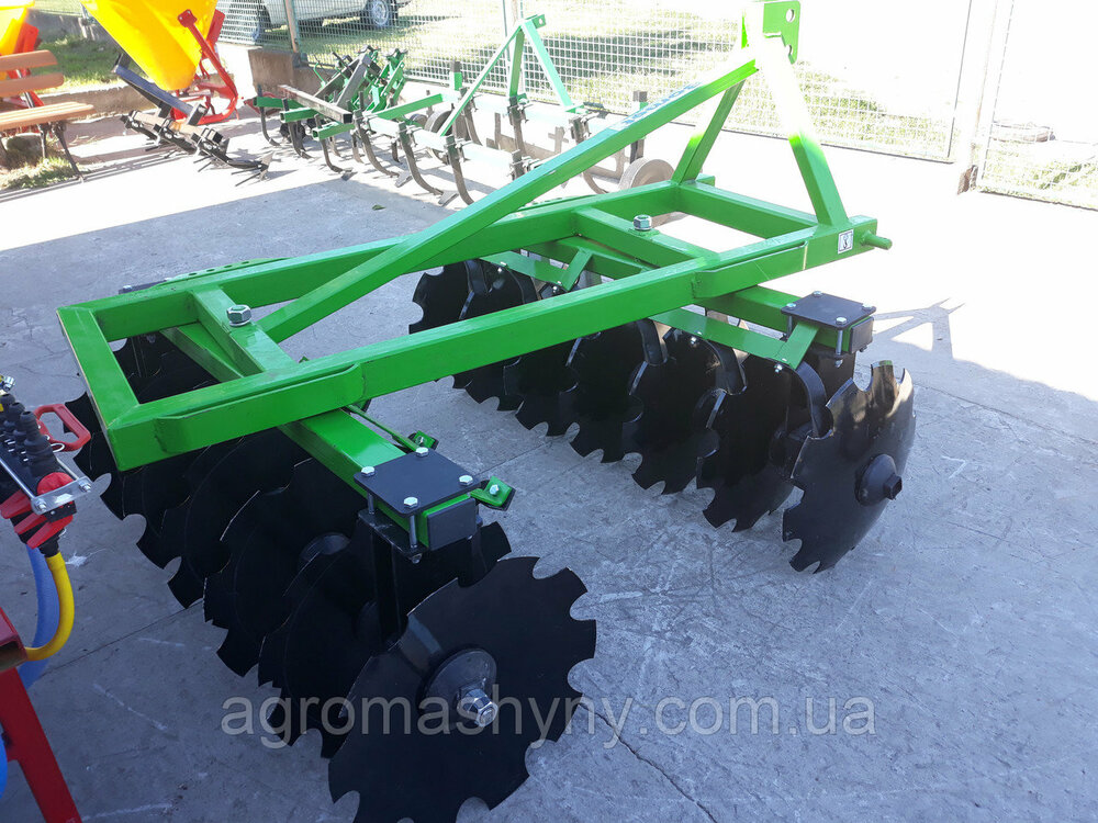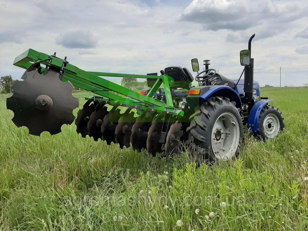 ⚙️ Дискова борона 2.0 м навісна — надійна техніка для обробки ґрунту Дискова борона навісна з шириною захоплення 2.0 м — це універсальне сільськогосподарське знаряддя, призначене для передпосівної обробки щільних ґрунтів, подрібнення рослинних решток, перемішування гною та добрив із землею. Ідеально підходить для фермерських господарств, які цінують якість, ефективність і простоту застосування. 🔧 Призначення: Розпушування ущільненого або зораного ґрунту Подрібнення дернини на луках і пасовищах Лущення стерні після збирання врожаю Перемішування органічних або мінеральних добрив Застосування у весняно-осінній сезон 🛠 Технічні характеристики: Ширина захоплення: 2.0 м Кількість дисків: 9 шт (в 2 секціях по 4+5) Діаметр дисків: 510 мм Товщина дисків: 4 мм Глибина обробки: 80–150 мм Кут атаки дисків: 7°–22° (регульований) Маса: 420 кг Необхідна потужність трактора: 40–55 к.с. Кількість секцій: 2 Тип: навісна V-подібна конструкція Матеріал дисків: загартована спеціальна сталь ✅ Переваги: Підходить для різних типів ґрунтів, окрім кам’янистих Швидке налаштування кута дисків під умови поля Надійна конструкція із загартованих сталевих компонентів Можливість дооснащення трубчастим або струнним котком Просте зчеплення з трактором за допомогою трьохточкової навіски 🧰 Сумісність: Трактори потужністю від 40 к.с. Агрегатується з технікою класу МТЗ, ЮМЗ, DF, Jinma, Lovol, Belarus