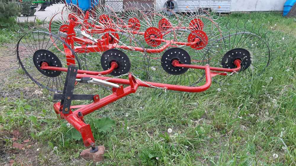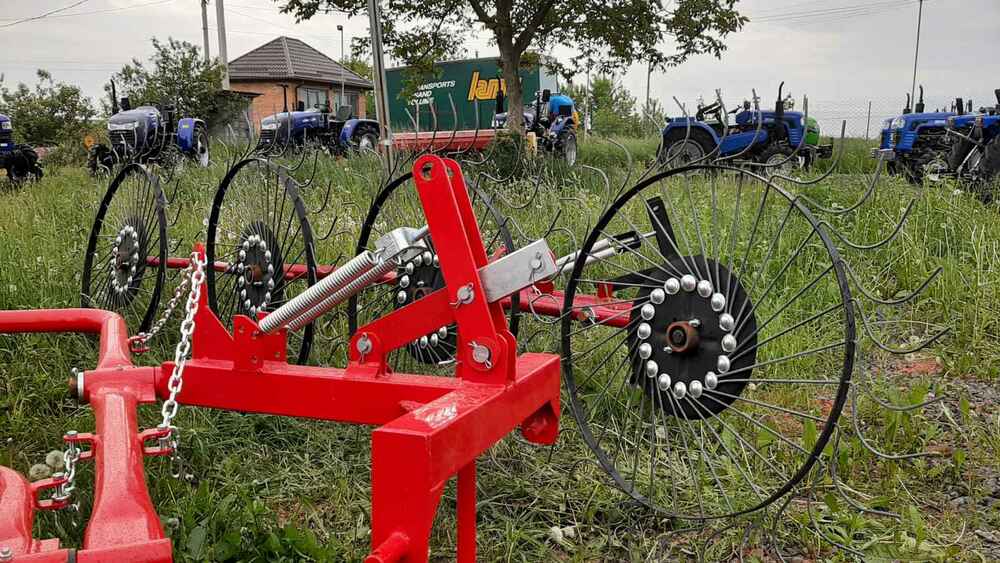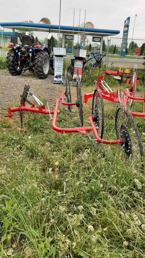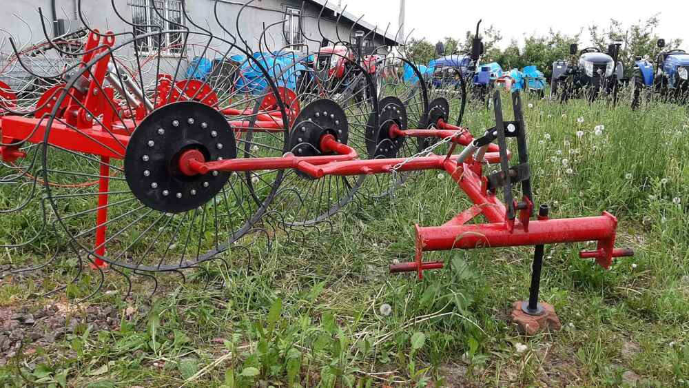 Гребка сонечко на 5 коліс — ефективна сінозгортальна грабарка для мінітракторів Гребка-сонечко на 5 коліс — це надійна й практична грабарка-сіноперекидалка, призначена для згрібання, перекидання та формування валків скошеної трави, сіна, люцерни й інших кормових культур. Вона підходить для використання з будь-яким мінітрактором або трактором, завдяки своїй малій вазі (всього 140 кг) та простій конструкції. Основні переваги: ✅ 5 робочих коліс забезпечують ширину захоплення до 3.1 м, що дозволяє швидко обробляти великі площі; ✅ Два режими роботи: згрібання або перекидання, в залежності від потреб господарства; ✅ Надійна конструкція, проста в обслуговуванні, ідеально пасує для фермерських господарств малого та середнього масштабу; ✅ Працює зі швидкістю до 7–10 км/год, що забезпечує продуктивність 1.1–1.5 га/год; ✅ Легко агрегатується з тракторами від 18 к.с. Технічні характеристики: Робоча ширина: до 3.1 м Кількість коліс: 5 Продуктивність: до 1.5 га/год Габарити: 2.2 × 1.2 × 4.3 м Вага: 150 кг 🔧 Купуючи грабарку сонечко на 5 секцій, ви отримуєте ефективне рішення для збирання сіна, що заощаджує час, паливо та зусилля. Ідеально пасує для українських кліматичних умов і фермерських потреб. ❗ Потрібен варіант на 4 колеса? — також доступний!