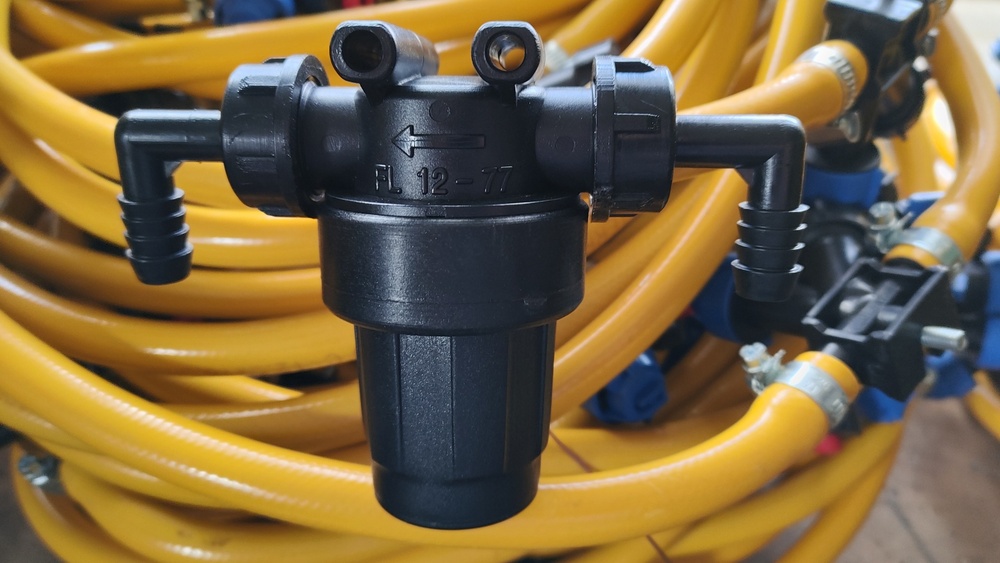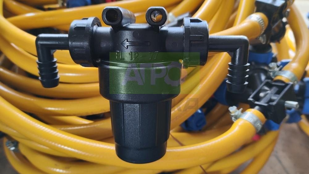 Міжсекційний напірний фільтр для обприскувача Tolveri — надійний захист форсунок від забруднень Міжсекційний напірний фільтр встановлюється безпосередньо на лініях окремих секцій обприскувача, забезпечуючи ретельне очищення робочої рідини. Він ефективно усуває забруднення, що можуть стати перешкодою для функціонування форсунок, особливо тих, що мають дрібні щілинні отвори. Основні характеристики та переваги фільтра: В комплекті — прозорий стакан-відстійник, який витримує високий робочий тиск і стійкий до агресивних речовин, що містяться в обприскувачах і добривах; Всередині стакана розміщена сітка з високим ступенем фільтрації, яку легко зняти для чищення; Фільтр розроблений під стандартний шланг діаметром 12,5 мм, що забезпечує сумісність з більшістю обприскувачів Tolveri; Максимальний робочий тиск — до 10 атмосфер; Пропускна здатність — 55 л/хв при тиску 0,5 атмосфери; Забезпечує безперебійну роботу форсунок, подовжує їхній ресурс і покращує якість обробки рослин. Застосування міжсекційного напірного фільтра є важливим елементом для забезпечення надійної і якісної роботи обприскувача, особливо у разі використання складних препаратів і мінеральних добрив. Це дозволяє уникнути засмічень, зупинок і нерівномірного розпилювання, що позитивно впливає на ефективність захисту рослин та внесення добрив.