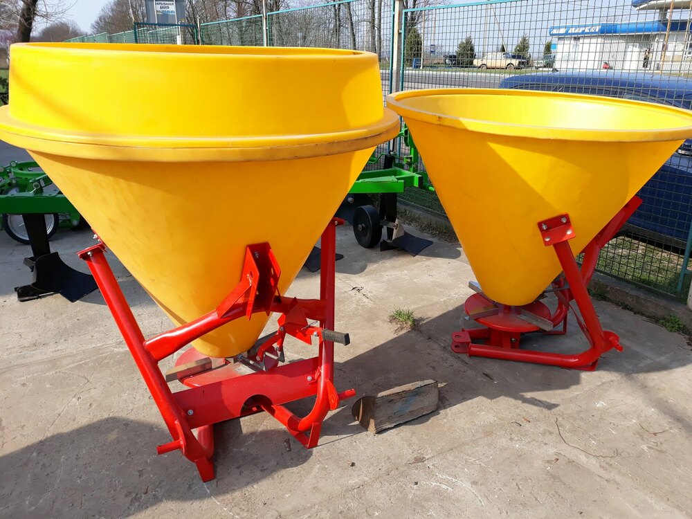 Розсіювач мінеральних добрив на 500 кг Розсіювачі мінеральних добрив використовуються для поверхневого внесення та розкидання гранульованих мінеральних добрив на полях, луках, пасовищах і ріллі. Конструктивно обладнані конусним резервуаром з пластику чи металу місткістю 300, 500, 650 кг або 1.0 тонну. Модель на 500 кг — це навісний однодисковий розсіювач з 4 лопатками, який агрегатується з тракторами потужністю від 20 кінських сил. Обладнаний трьохточковим кріпленням для надійного з'єднання з трактором. Резервуар має форму конуса, що забезпечує ефективне переміщення добрив до вихідних отворів. Дозування здійснюється через два регульованих отвори, контрольовані важільним механізмом із затворами. Розподіл добрив здійснюється через обертовий диск, що приводиться в дію від карданного валу через редуктор. Всередині резервуара добрива перемішуються мішалкою, яка теж працює від редуктора. Відцентрова сила обертового диска забезпечує рівномірне розкидання добрив по площі. Основні характеристики: Тип: навісний Об’єм бака: 500 л Кількість дисків: 1 Кількість лопаток: 4 Ширина розкидання: 6–14 м Норма висіву: 50–1500 кг/га Оберти вала відбору потужності: 540 об/хв Необхідна потужність трактора: від 20 к.с. Робоча швидкість: до 14 км/год Габарити: 1.45 × 1.45 × 1.55 м Вага: 105 кг