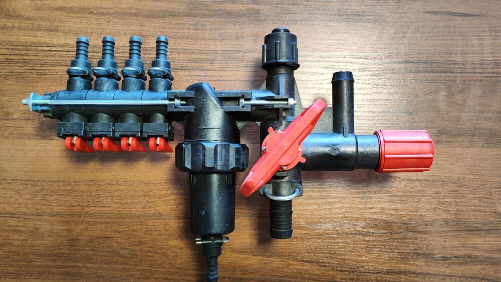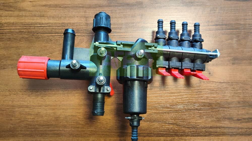 Розподільник польового обприскувача — важливий елемент системи точного оброблення рослин Розподільник для обприскувача, також знайомий як регулятор тиску, є однією з найважливіших деталей обприскувача після насоса. Він відповідає за рівномірне постачання робочої рідини під необхідним тиском на штангу обприскувача, котра через форсунки розпилює захисні препарати та добрива на рослини. За допомогою регулятора тиску оператор може точно налаштувати тиск, оптимальний для конкретного виду обробки та культури, що гарантує ефективне і економне використання хімічних речовин. Тиск, встановлений на розподільнику, контролюється через манометр, що дозволяє оперативно реагувати на зміни в роботі агрегату. Розподільник зазвичай має три, чотири або більше секцій, які можна вмикати чи вимикати окремо, що дає змогу обробляти лише потрібні ділянки поля. Це підвищує гнучкість і точність у роботі, дозволяє уникнути зайвих витрат та забезпечує екологічну безпеку. Подачу рідини під тиском до розподільника забезпечує насос обприскувача, тому надійність і якість розподільника безпосередньо впливають на загальну ефективність роботи обприскувача. Ціна зазначена за розподільник на 4 виходи без манометра. Для отримання якісного розподільника польового обприскувача звертайтеся до нашої компанії — гарантуємо надійність, довговічність та професійний сервіс!